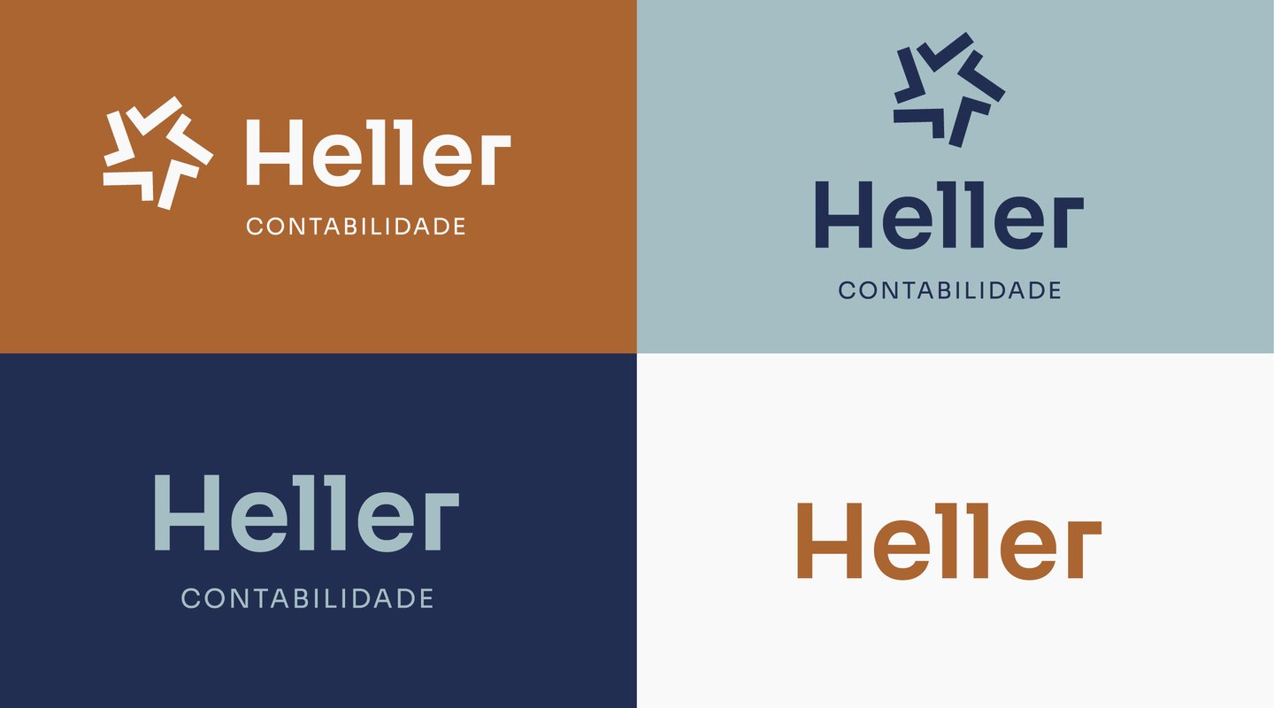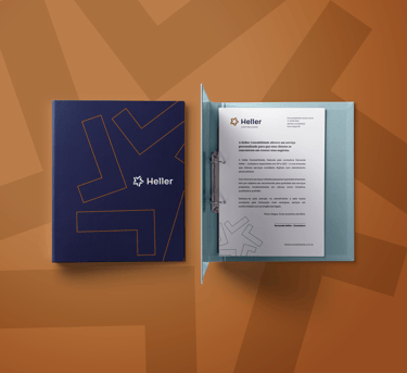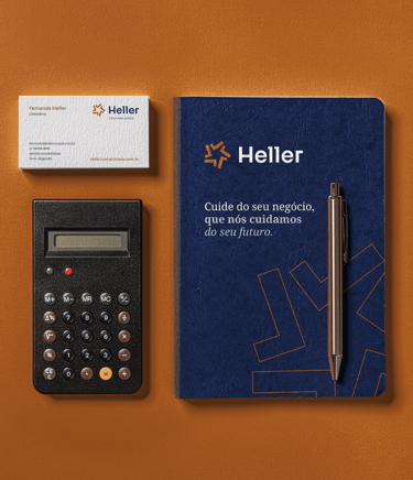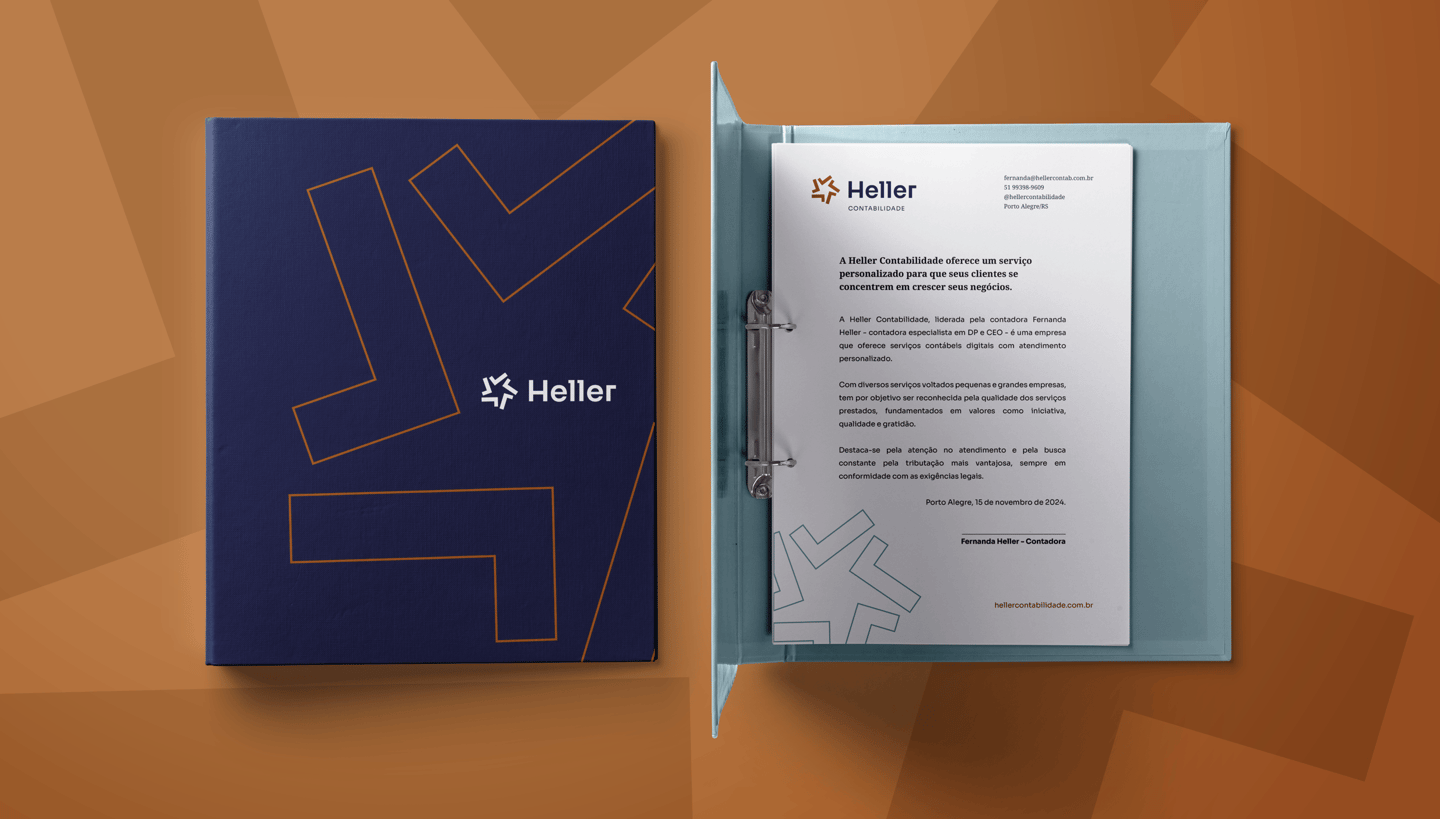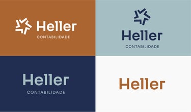 A Fernanda, CEO da Heller, sempre gostou do azul, mas queria se destacar no mercado contábil, fugindo do óbvio. Desafio aceito! Em vez de abrir mão da cor, incorporamos dois tons de azul à identidade visual, equilibrados com um marrom alaranjado, criando um diferencial marcante sem comprometer os valores e a essência da marca.