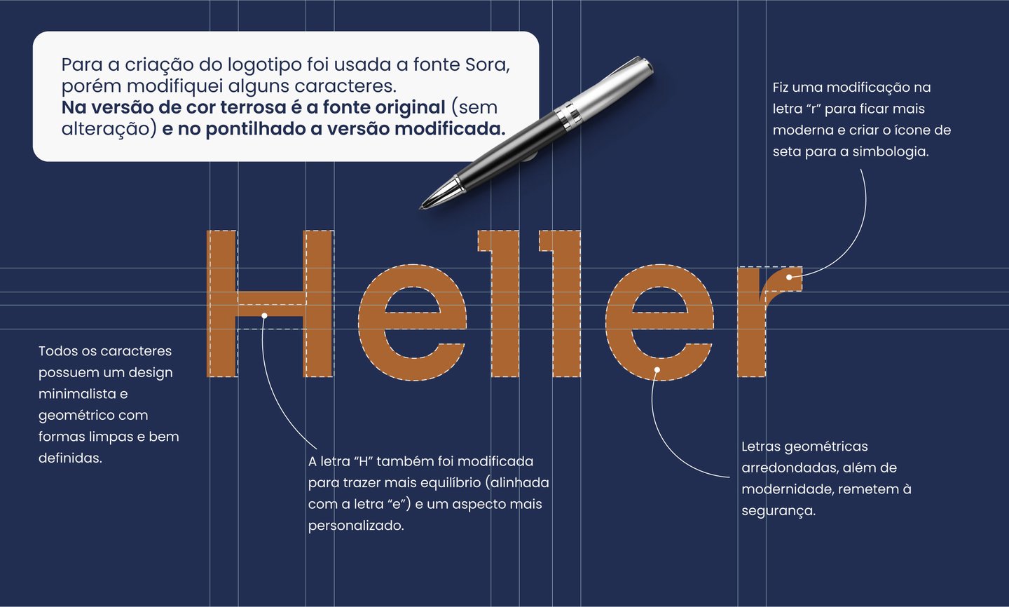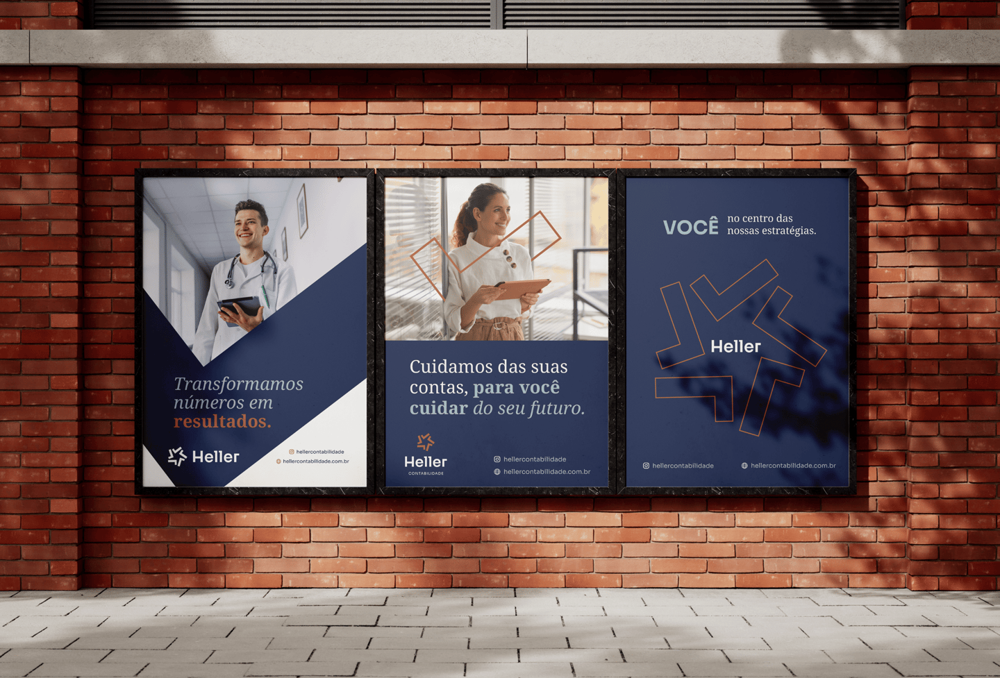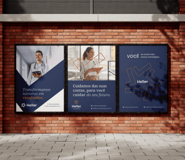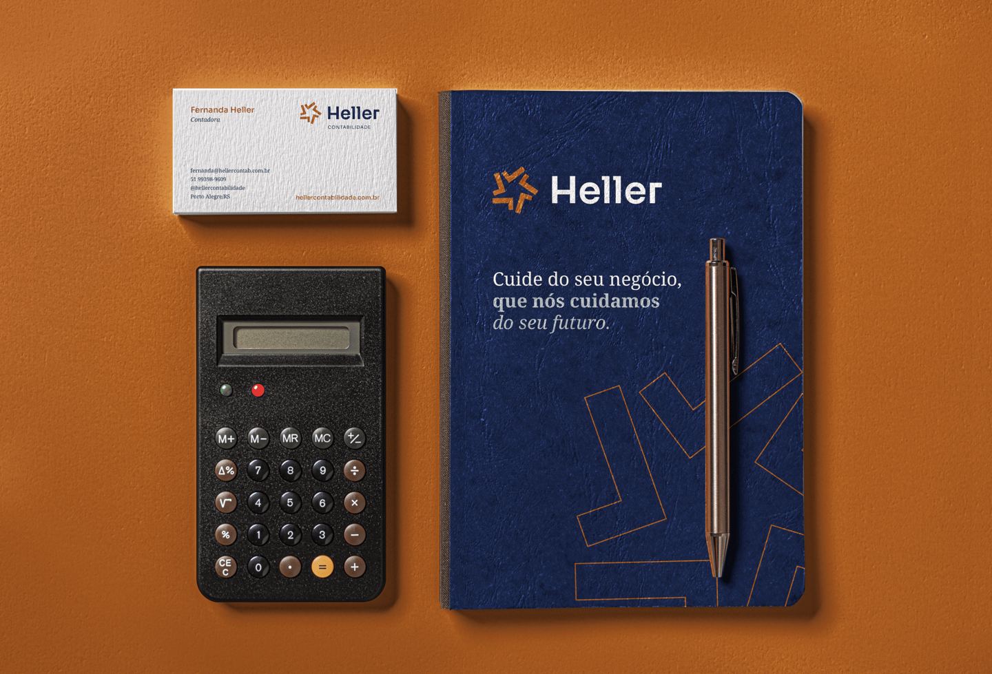A Fernanda, CEO da Heller, sempre gostou do azul, mas queria se destacar no mercado contábil, fugindo do óbvio. Desafio aceito! Em vez de abrir mão da cor, incorporamos dois tons de azul à identidade visual, equilibrados com um marrom alaranjado, criando um diferencial marcante sem comprometer os valores e a essência da marca.