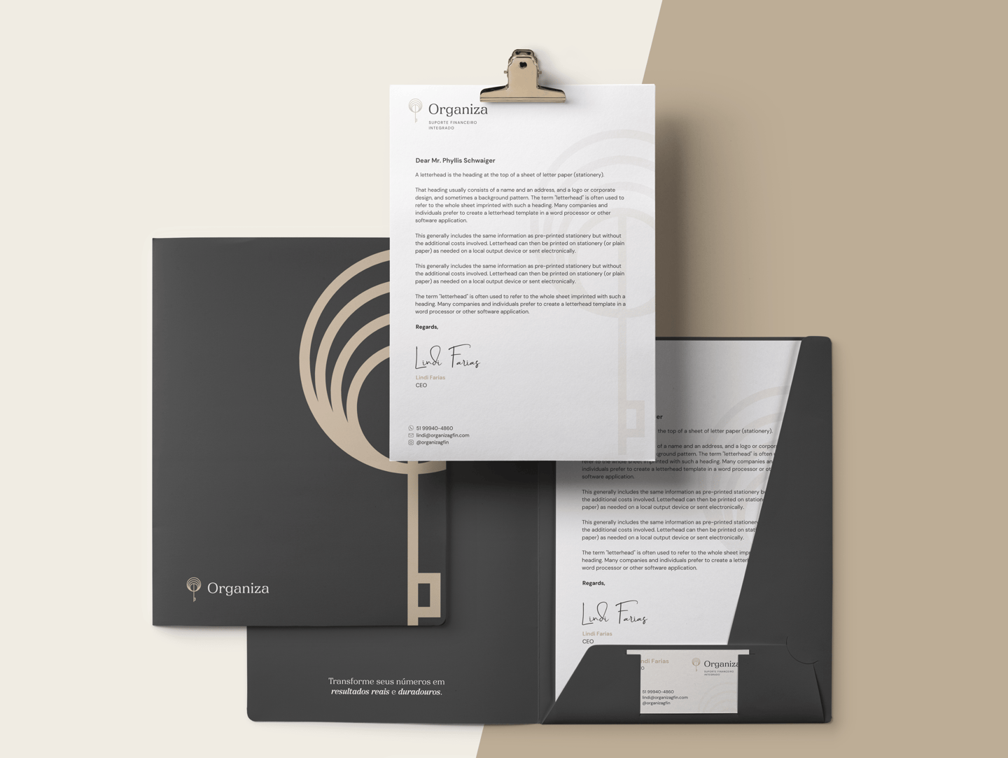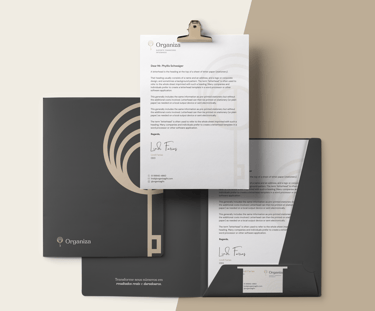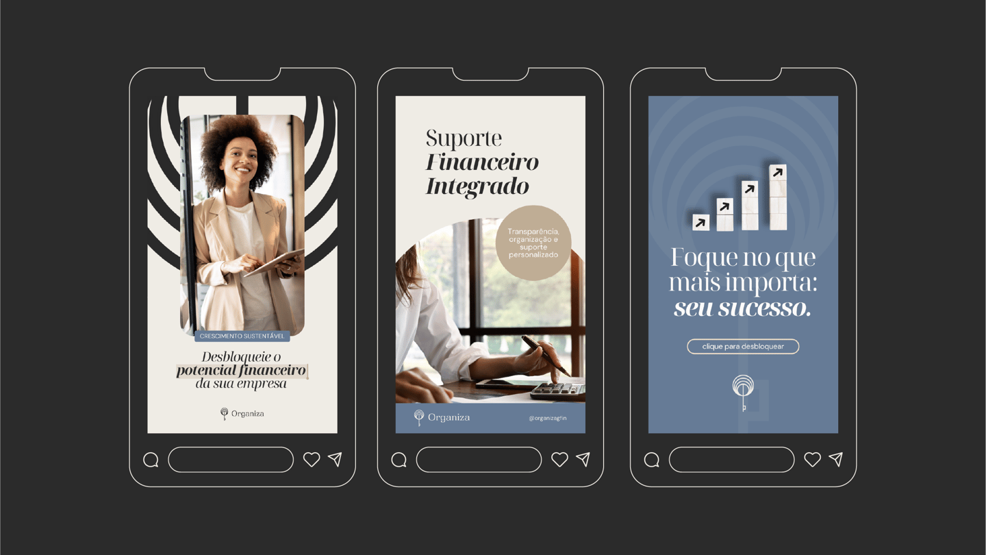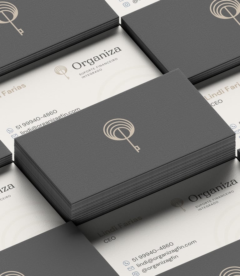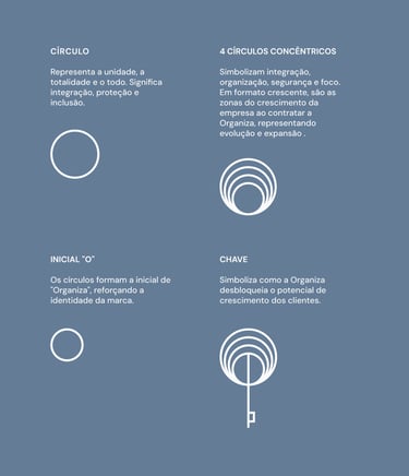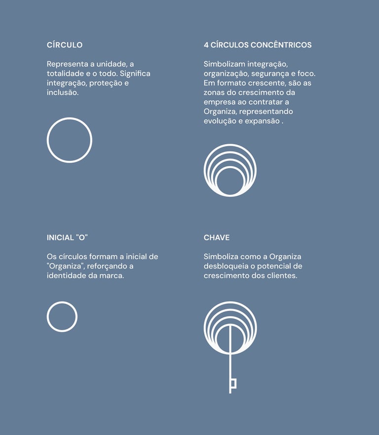 Então, foi essencial que cada elemento da identidade visual fosse pensado estrategicamente para comunicar essa essência. O círculo representa a unidade, a totalidade e o todo. Significa integração, proteção e inclusão. A chave é o desbloqueio do potencial das empresas que a Organiza atende. E a paleta de cores reforça a confiança, a modernidade e a humanidade do atendimento.